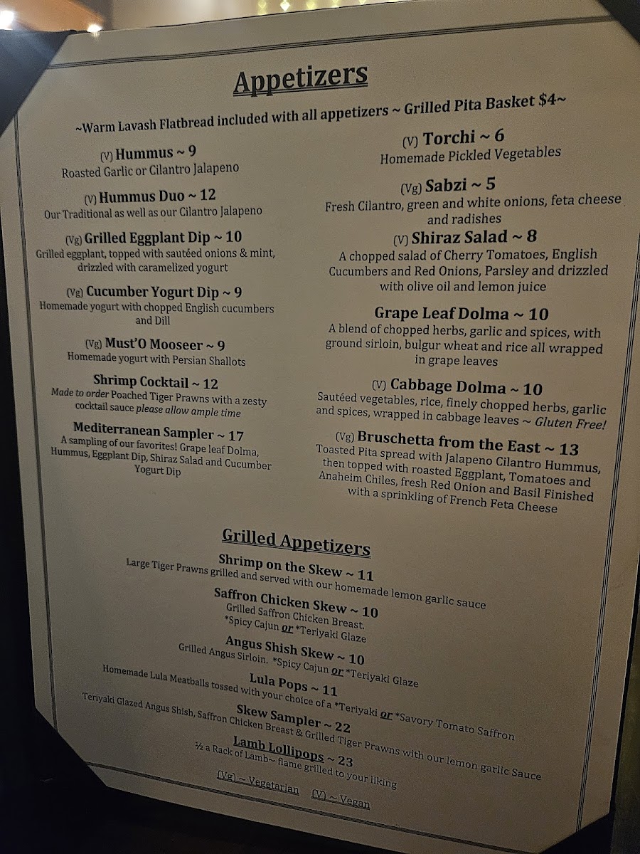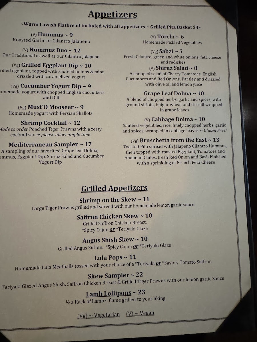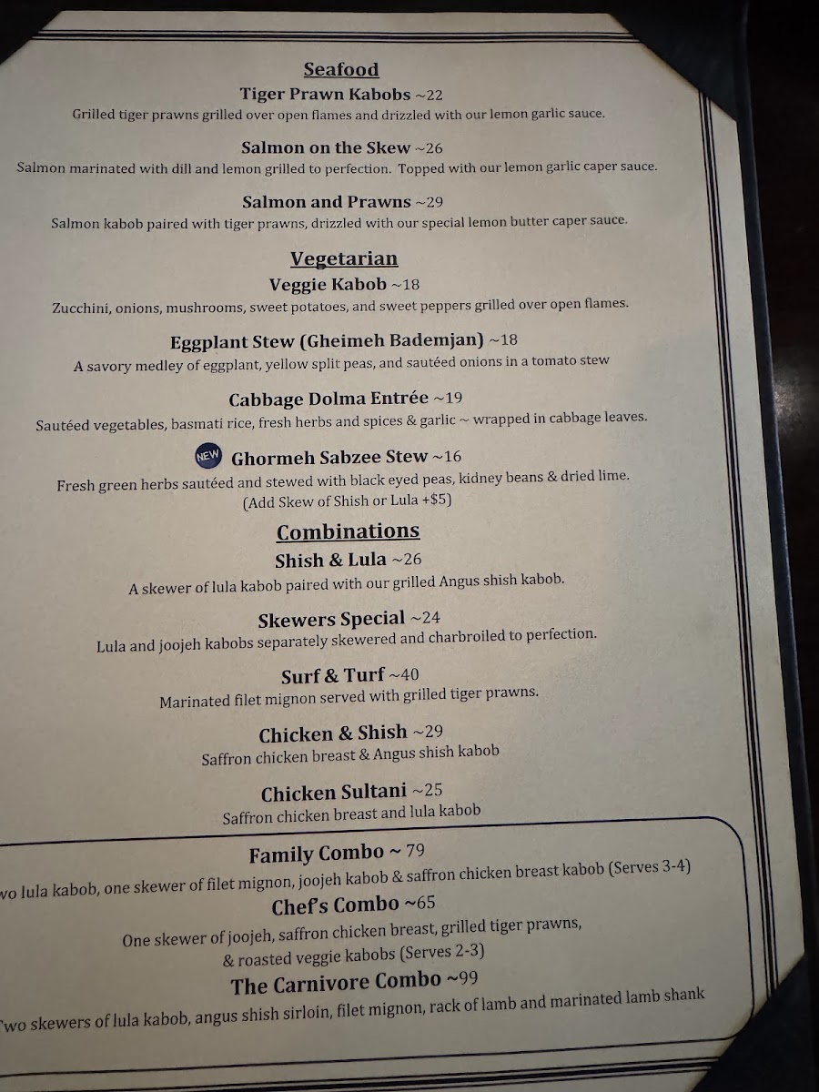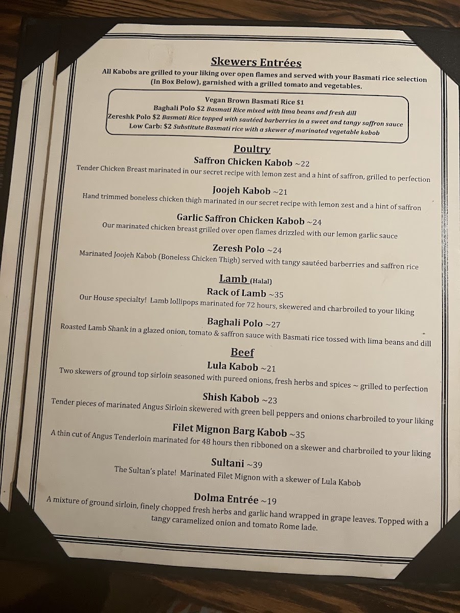 Prepare your taste buds for an array of tantalizing dishes! The menu specializes in succulent skewers, featuring highlights such as the Joojeh Kabob, a Halal-option grilled chicken marinated to perfection and infused with saffron ($21.00), and the Garlic Saffron Chicken Kabob, which is a delightful option for garlic enthusiasts ($24.00). Not to be missed is the Zeresh Polo — a fragrant jeweled rice dish elevating the meal with its irresistible saffron flavor ($24.00).
